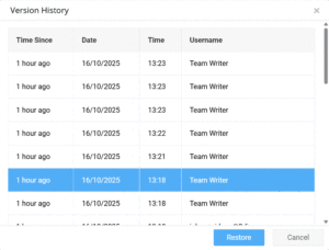 You can revert to a previous version of your project by selecting the appropriate timestamped row and clicking ‘Restore’. This restored version then becomes the top item in the Version list, while the rest of the list remains in reverse chronological order.