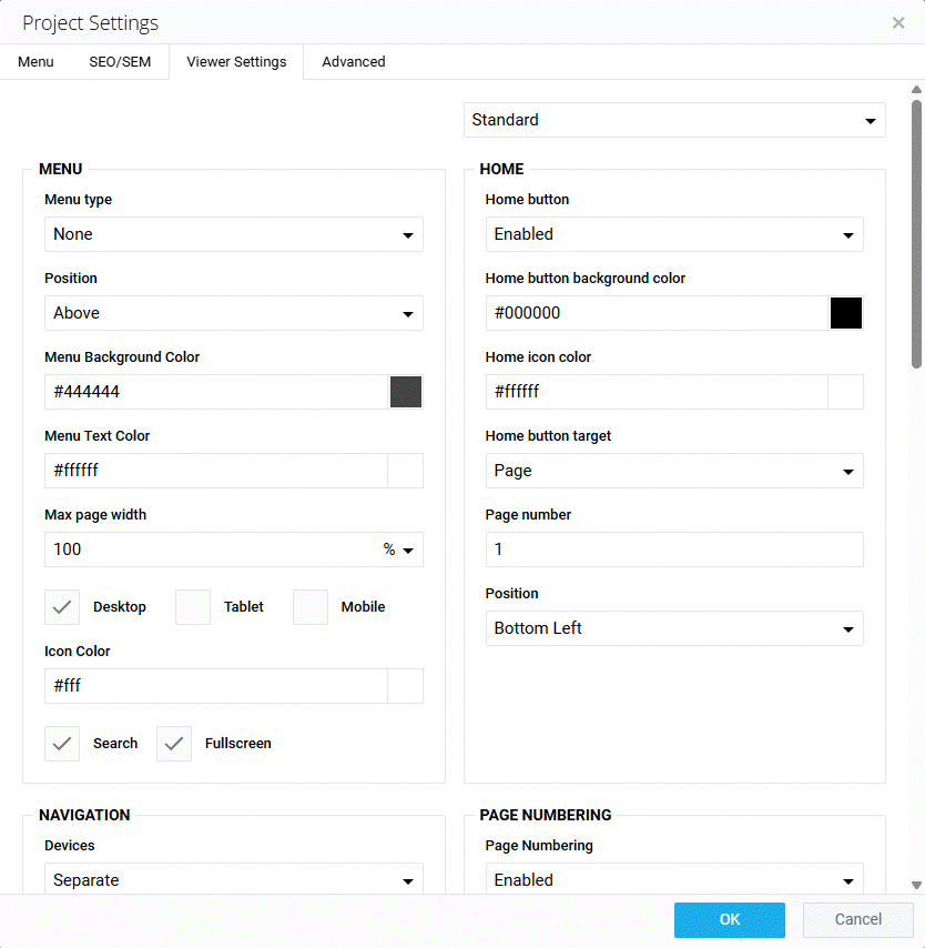 The Viewer Settings tab allows you to customize how your publication will be presented in the Experios viewer. Settings relate to the Menu Bar, Home Button, Page Numbering, Navigation Arrows and Dialog Boxes.